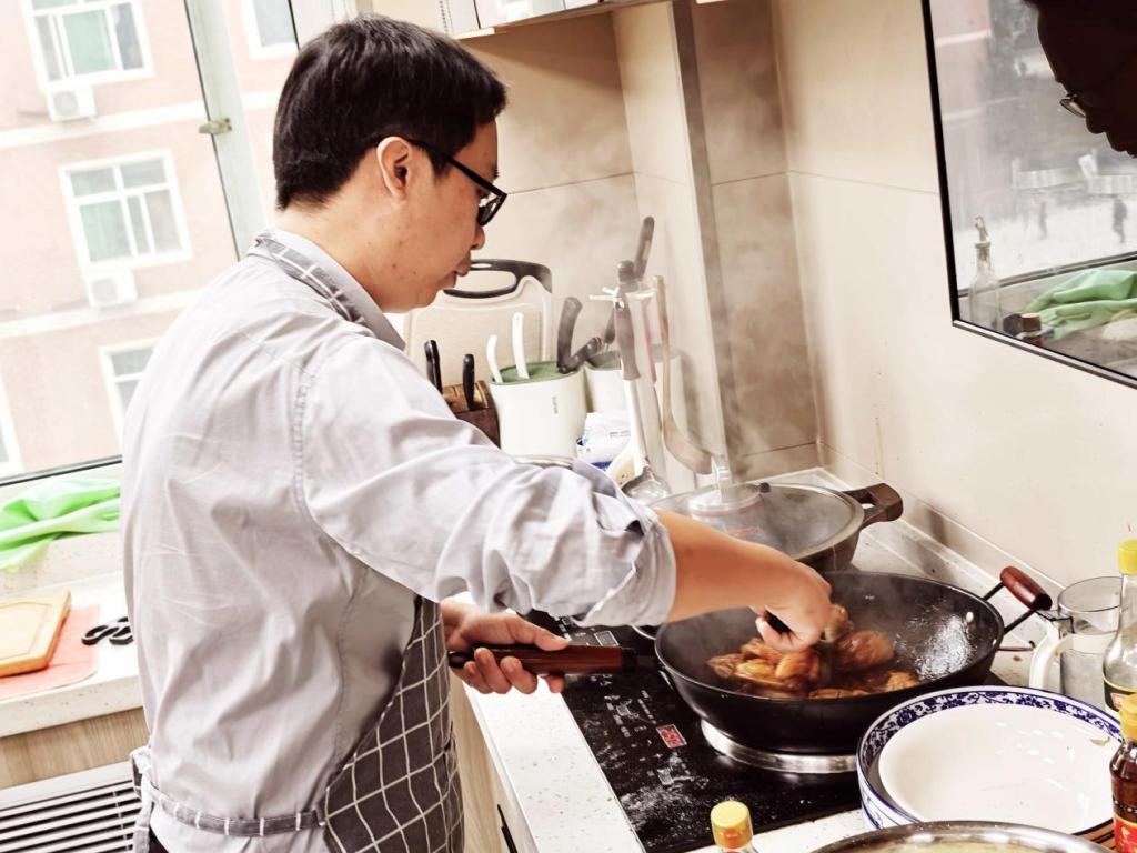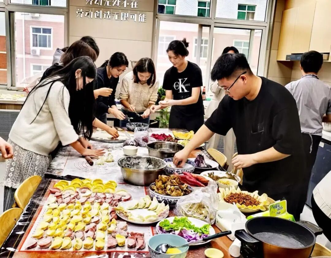活动当天,师生一行清晨前往农贸市场,精心挑选各类新鲜食材,并有序分工,投入调料准备、蔬菜清洗、蛋液打制等前期工作。在随后的集体烹饪环节,师生携手包制饺子、共烹拿手菜肴,厨房内气氛热烈、笑语不断,全程流程紧凑、协作默契,展现出良好的团队配合意识。