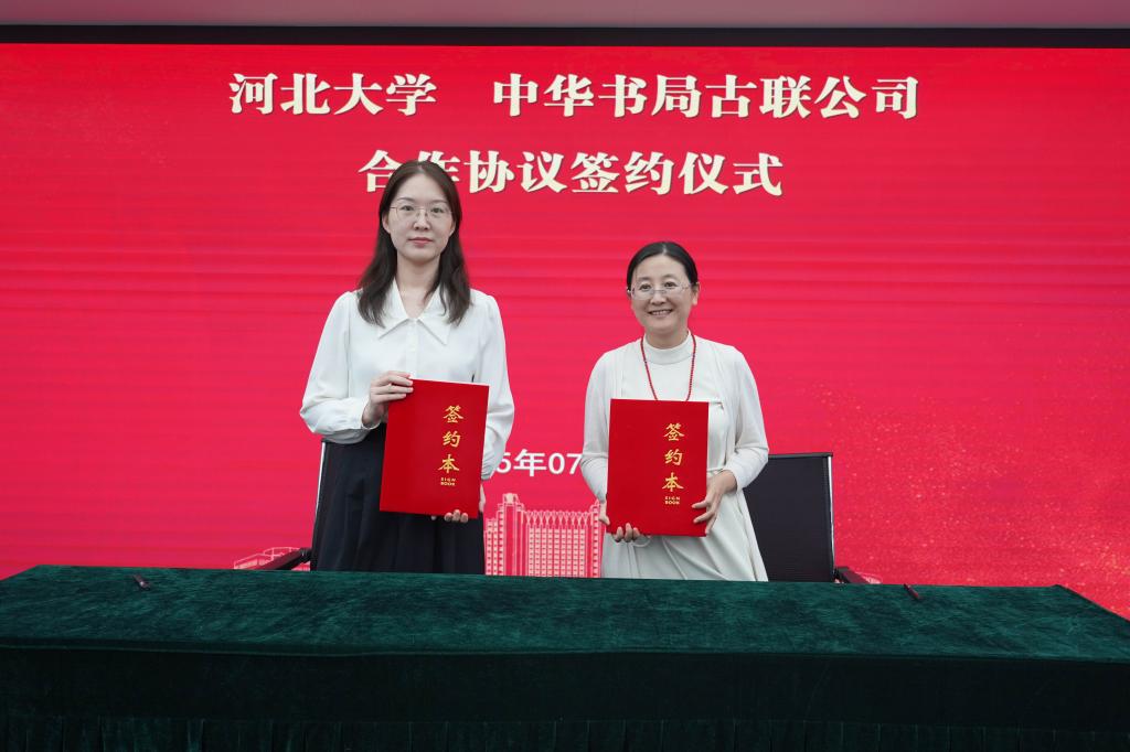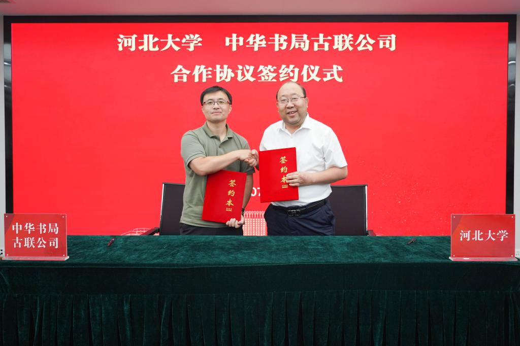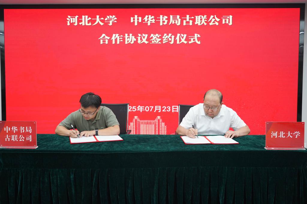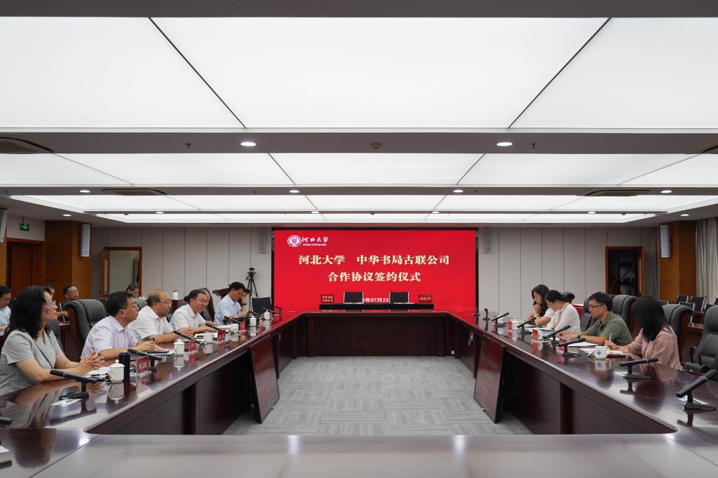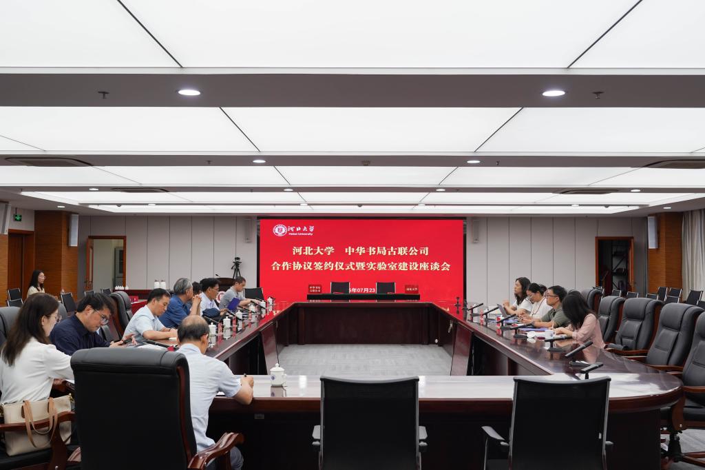7月23日,河北大学与中华书局古联公司合作协议签约仪式暨实验室建设座谈会在河北大学五四路校区举行。河北大学党委常委、副校长张锋,中华书局总经理助理、古联公司总经理洪涛、中华书局古联公司总编辑朱翠萍及文学院领导班子等出席仪式。签字仪式由哲学社会科学研究院张进红院长主持。